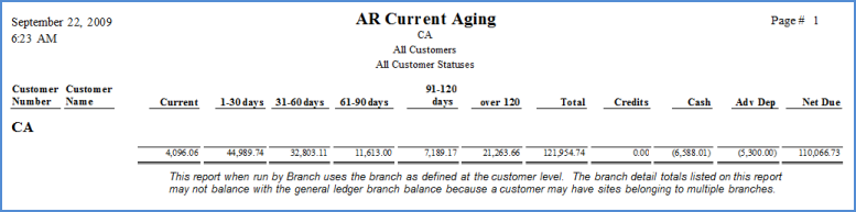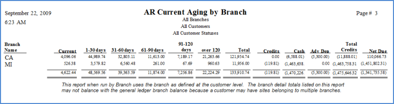 This version of the report will print the net amount due of invoices and credits in each aging bucket for each Customer.