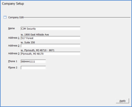 Enter the name of your company, address, phone and fax number. The city, state and zip code is entered in the Address 3 field. Press the Apply button to save the information. If the address or phone numbers of your company changes in the future, you may modify this setup form at any time.