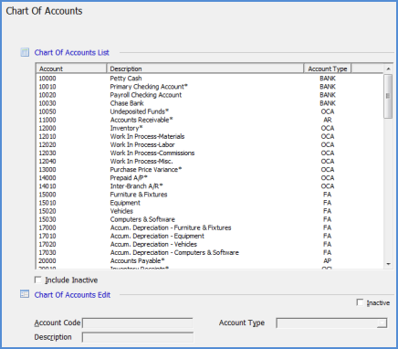 The Chart of Accounts is used to track all your financial data. If you already use an accounting system, you may already have a chart of accounts, or you may wish to discuss this with your CPA prior to setting up this table. A default chart of accounts was included with your SedonaOffice database. You may use this set of accounts, add additional accounts, delete accounts not used by your company or modify the account numbers or descriptions. The length of the G/L account number must be all numbers and the number of characters long was defined in the setup table, Define G/L Segments and Length.