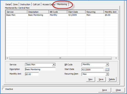 The Central Station Tracking Monitoring form is used to track services for which you are paying an outside central station for the system. Each service entered is linked to a recurring item for which your customer is being invoiced for this service. Using this option provides a good check and balance to make certain recurring lines have been set up to invoice your customer for the services being provided by the central station.