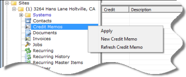 When highlighting the Systems menu option, the Active Pane will display a list of all active and inactive Systems for the Site. Right-clicking on the Systems menu option will display a list of the following options: Apply, New Credit Memo and Refresh Credit Memo.