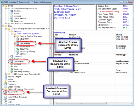Existing Documents and Scanned Documents may be attached to a Customer, Site or System record from the Customer Explorer. The process is the same for attaching, editing or deleting documents in any area of the Customer Explorer. Below is a screen shot of a Customer Explorer record showing where documents may be attached or located for viewing.