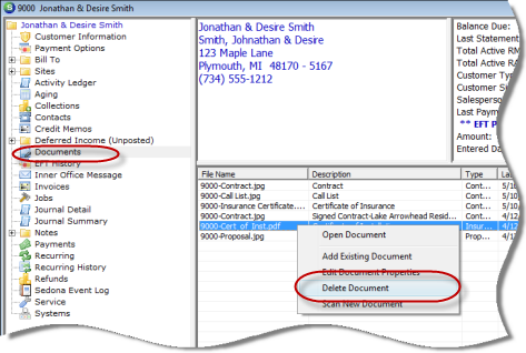 1. To Delete an existing Document highlight the Documents option from the Customer tree. In the Active Pane highlight the document to be deleted; right-click and select the Delete Document option.