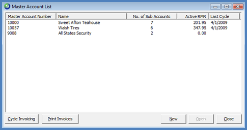 1. Navigate to the Client Management / Master Account Management menu option and select the Cycle Invoicing button located at the lower left of the Master Account List.