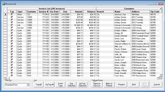 4. The Invoice List will be displayed in a grid with all the invoices that met the criteria for the options selected. By default, all invoices are “Tagged” for printing. Tagging an invoice indicates which invoices will be sent to the printer. From the list of invoices displayed, the User has the option of removing one or many invoices from the list that will be sent to the printer by using the “Un-Tag” options buttons or un-checking the Tag checkbox to the left of the invoices that will not be printed at this time.