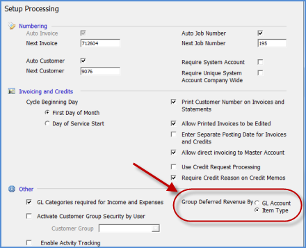 There a two choices for the manner in which Deferred Income will post to the General Ledger when the Deferred Income Process is run. This is controlled by a setup option in SedonaSetup/Setup Processing (AR)/ Group Deferred Revenue By. The two options are by GL Account or by Item Type. If the option by GL Account is selected, when cycle invoices are posted, the Deferred Income to be earned will be group by unique Income Accounts assigned to the Invoice Items on the invoice. The other option of by Item Type provides more detail on how the Deferred Income will be group, by unique Invoice Items listed on the invoice.