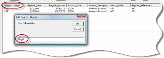 To change a field name column header, in the Report Query Results area, double-click on the column title to be changed. An edit box will be displayed where the User will type in the words that will be displayed for the selected data field column. Press enter or the OK button to save. Any modifications made to column titles will be saved with the Report Query Design file.
