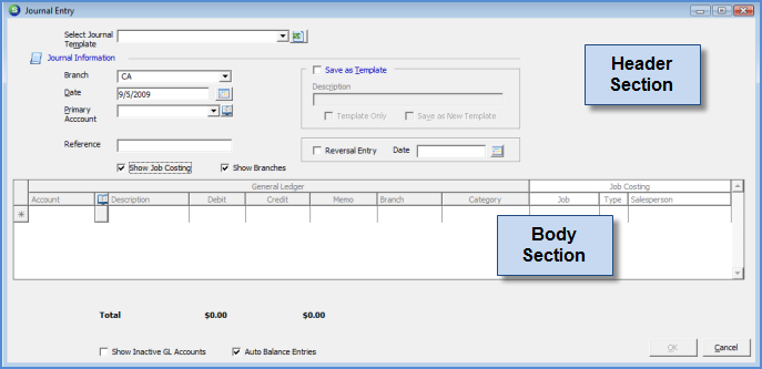 To open a blank Journal Entry form, navigate to the General Ledger module from the Main Application Menu and select the Journal Entry option. The Journal Entry form will be displayed. This form is divided into two main sections; the Header and Body. The fields and options in each section will be defined on the following pages.