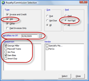 3. The Royalty/Commission Selection form will be displayed. This form is divided into six sections; Type, Due, Paid, Royalties As Of, Salesperson and Vendor.