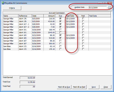 4. A listing of all Job Commissions which met the criteria selected will be displayed in the grid area of the Royalties & Commissions form. For the Job Commission lines that you wish to mark with a due date, first select the date on which the commissions are due in the Update Date field in the upper right of the form, then select the Due checkbox for each Job Commission line that is ready to be paid on this date.