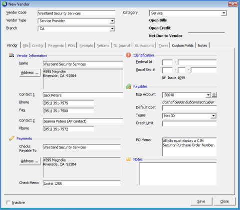 4. Once all information has been entered, press the Save button located at the lower right of the New Vendor form.