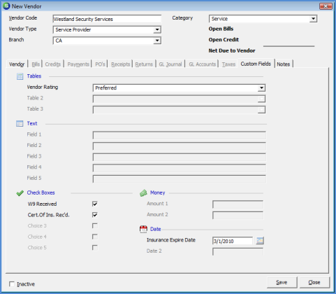 Access to this data entry form will only be allowed if the User has permissions granted within User Group Security. The data entry fields must first be assigned in SedonaSetup/Custom Fields-Vendor to be available for use. The information on this form is for internal company use and reporting purposes.