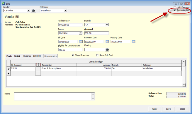 2. Once the Bill form is displayed fill in the required and optional information. Select the Recurring Bill option in the upper right area of the Bills form.
