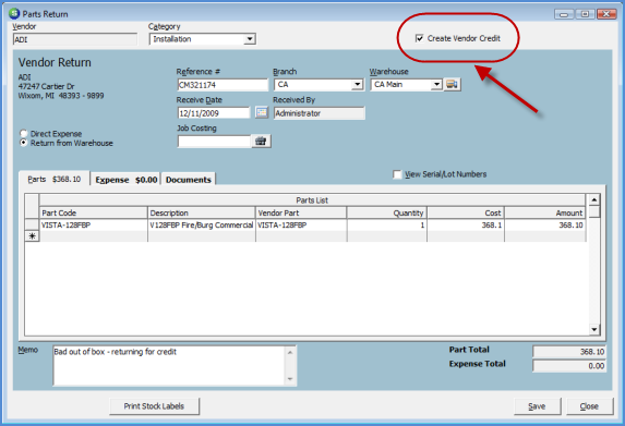 4. The Parts Return form will be displayed. At the upper right of the form select the Create Vendor Credit option, then press the Save button located at the lower right of the Parts Return form.