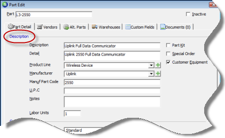Notes - The User may enter information which is pertinent to the part. For example, if another part is needed when using this part, you may type in a note referencing the other part.