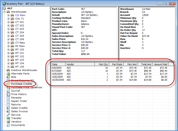 Highlighting this option will display a list of all Vendor Credits created for parts Returned to a Vendor for the part. Double-clicking on a record in the Active Pane will open the Vendor Credit record for viewing. If the date on which the Vendor Credit was created is in an open accounting period and the Credit has not been applied to a bill, the Vendor Credit may be modified and re-saved. Security permissions are required to edit a Vendor Credit.