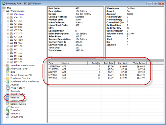 Highlighting this option will display a list of all Return to Vendor records created for the part. Double-clicking on a record in the Active Pane will open the Part Return record for viewing. If a Vendor Credit has not been entered for the Part Return and the date of the return is in an open accounting period, it may be modified and re-saved.
