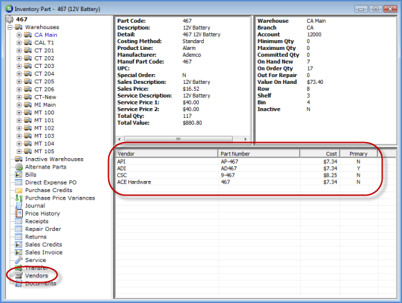 When highlighting Vendors from the menu tree, the Active Pane will display a list of all Vendors entered on the Vendors form within the Part setup; these are the Vendors from which the part may be ordered on a Purchase Order.