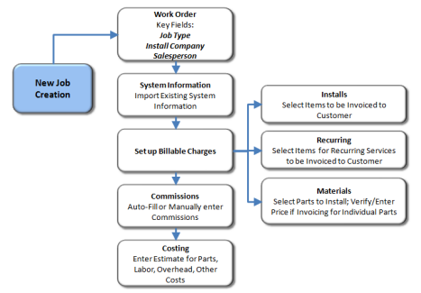 When creating a new Job, there are several data entry forms to complete by the User. The diagram below illustrates the typical new Job data entry. If your company is using QuoteWerks, all information except the Costing Estimate and Commissions will automatically fill into the data entry forms from the QuoteWerks sales order.
