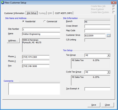 6. The Site Setup form will be displayed. The name and address information automatically filled into this form was pulled from the information on the Prospect Opportunity form. If this information is not the correct site information the User may modify any of the information. Fill out this form according to your company policy and procedures. When finished, press the Custom Fields (last tab) form tab. If the Custom Fields tab is grayed-out, this indicates either your company is not using Custom Fields at this time or the User does not have permissions to access this form. If your company is not using Custom Fields, press the Save button located at the lower right of the Site Setup form, then proceed on to step number 8.