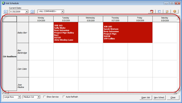 The center area of the Job Schedule is filled with the Schedule Grid. Along the left side of the grid, all Installer Names are displayed and across the top are the days of the week. If your company has more than one Install Company and All Install Companies is selected in the upper filter, a column will be displayed to the left of the Installer Names showing the Install Company to which the Installer is primarily assigned. As Jobs are scheduled, they will appear in the corresponding row/column for the Installer/Scheduled Date(s).