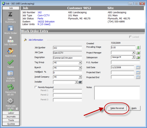 The Sales Reversal function is used when a Job has been cancelled and your company will not be completing the Job. Processing a Sales Reversal will created a Sales Reversal Change Order that will create negative amounts for all Install Charges, Recurring Charges and Part Charges entered on the Job. If the Job has already been invoiced and you want to reverse the invoice(s), a User will have to credit these off manually. If parts were issued to the Job and the parts are being returned to the warehouse, a User will need to perform a return to stock transaction. Once the Sales Reversal has been completed, the Job Status will be changed to Reversed and drop off the Job Queue listing, but remain on the customer explorer as a part of the customer job history. The job will become locked and no other transactions may be performed for the reversed job.