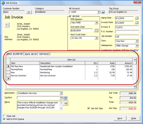 The Items form is automatically filled in with all Install Charges and Recurring Charges setup on the Job that have not yet been invoiced. The quantity column for Recurring Charges is controlled by the dates entered in the Bill RMR section of the Invoice Header. For more information see Bill RMR on page 1 of this topic.