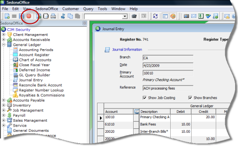 To delete a Journal Entry, open the transaction detail, then press the Delete button on the Application Function Button toolbar. The User will be presented with a confirmation message; press Yes to proceed with the delete.